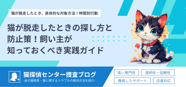 脱走しても慌てないようにしましょう。まずは深呼吸をして、周囲を確認してください。猫は恐怖で動けなくなっていることが多く、遠くへ逃げるケースは少ないです。狭くて暗い場所を中心に静かに探してみてください。