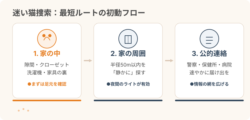 もし脱走に気づいたら、深呼吸をして冷静になりましょう。焦って大声を出して探し回ると、逆に猫を怖がらせて遠くへ追いやる原因になります。ここからは、発見率を上げるための具体的なステップを順番に解説していきます。