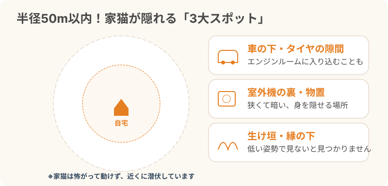 家猫が外に出た場合、実は家のすぐ近く(半径50メートル以内)の物陰にじっと隠れていることがほとんどです。