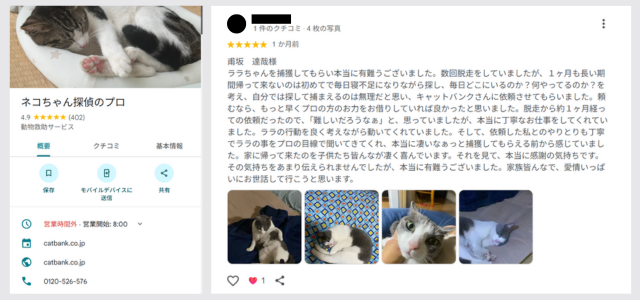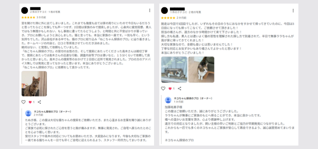 猫ちゃん探偵のプロでは、Googleマップの口コミからも、依頼者からの信頼の声が数多く寄せられています。