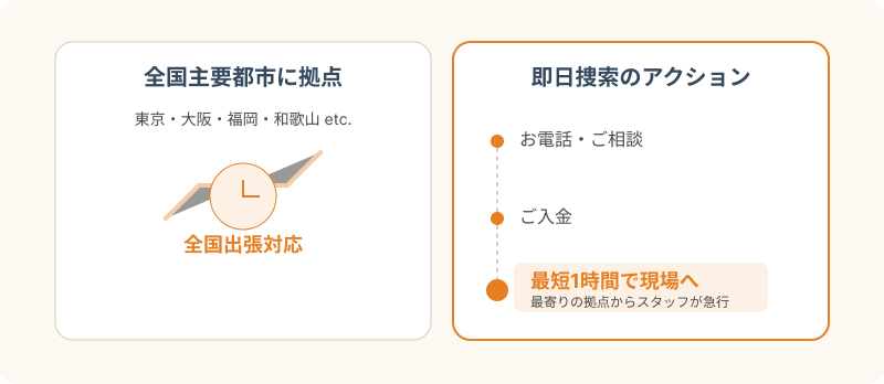 地方にお住まいの場合でも全国出張捜索に対応しており、近くの拠点からスタッフが速やかに現場へ向かうため、ご入金から最短1時間で駆けつける即日対応も可能です。