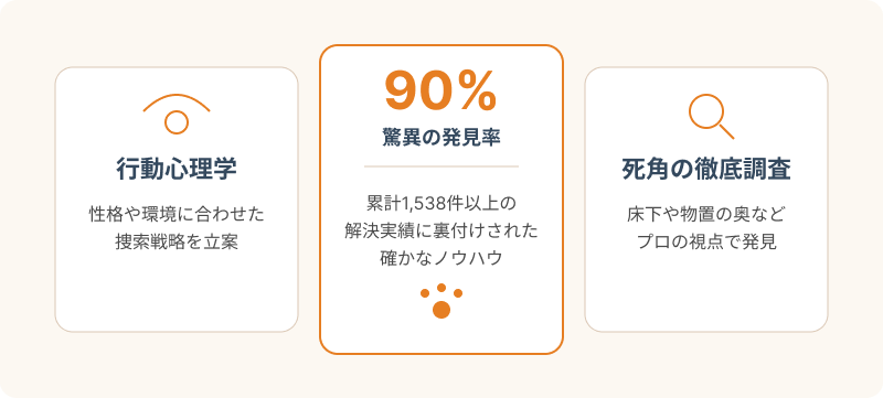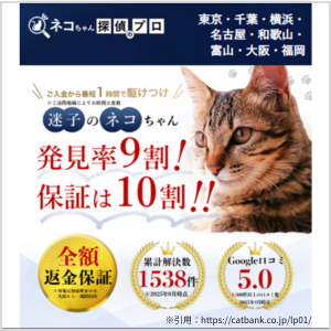 - 猫の行動心理学に基づいた独自のノウハウで、9割の発見率を誇る