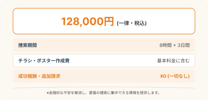 猫ちゃん探偵のプロは、「8時間×3日間」の捜索で一律128,000円という分かりやすい料金設定になっています。
