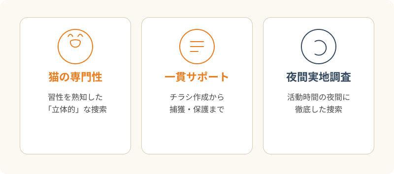 多くの飼い主さんがファインドキャットに依頼を決めるには、他社にはない「3つの決定的な強み」があるからです。