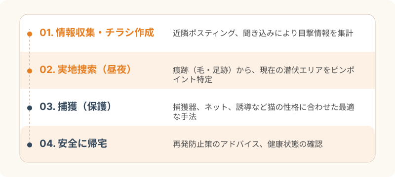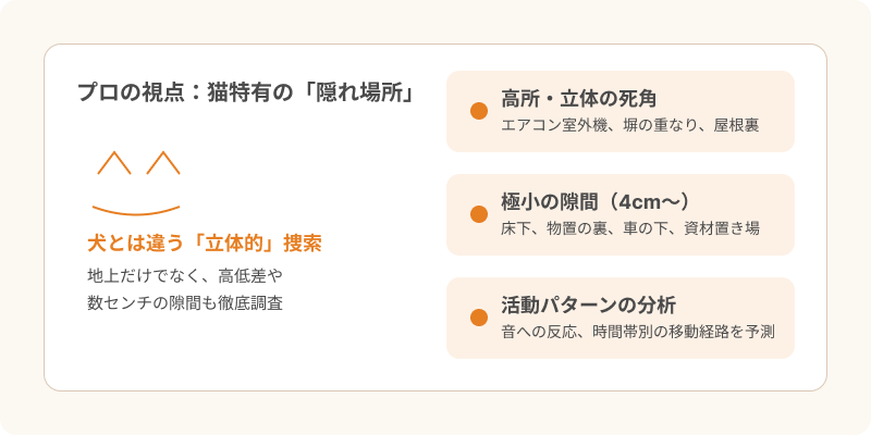 猫専門だからこそ、猫が好む隠れ場所や、音に対する反応、時間帯ごとの活動パターンを熟知しています。犬とは全く異なる「立体的な動き」や「極小の隙間」をプロの視点で見逃さないことが、高い保護率に繋がっています。