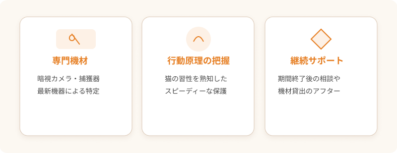 また犬・ウサギ・昆虫など猫だけに限定せず、ペットの行動原理にも精通しているため着手から保護までがスピーディーなのも強みといえるでしょう。