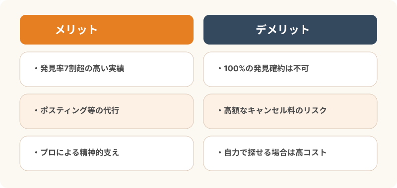 実際に聞き込みを周辺の住人の方におこなう、ポスティングやチラシ貼りの現地活動など、「自分ではできそうにない…」といった方の、背中を押すことができるのもメリットとして大きいでしょう。