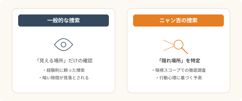 プロに依頼する最大のメリットは、「客観的な視点」と「専用機材」です。飼い主様はどうしても「いつも遊びに行っていた場所」など思い込みで探しがちですが、ニャン吉は猫のパニック状態を想定したエリア選定を行います。