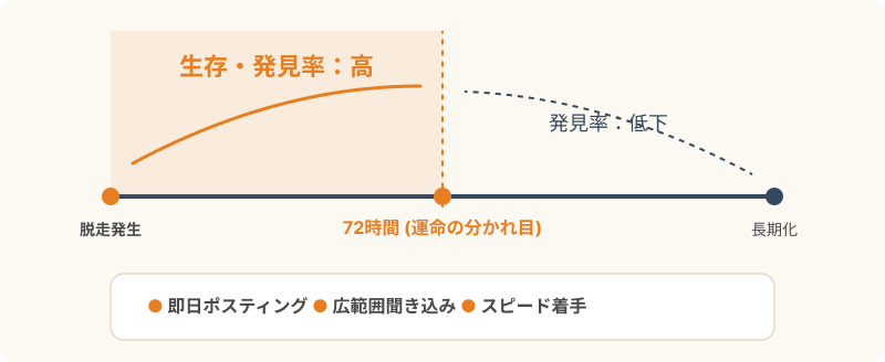 猫の捜索は、いなくなってから「72時間以内」の初動が運命を分けると言われています。ニャン吉は、依頼から実施までのスピード感を重視しており、周辺地域へのポスティングと聞き込みを迅速に行うことで、有力な目撃情報を効率的に集める仕組みを構築しています。