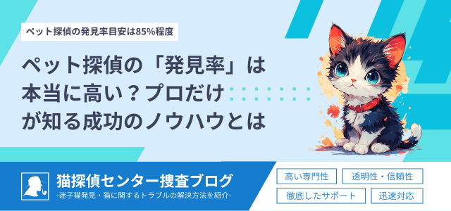 ペット探偵に依頼した際、猫の発見率は85%程度、犬の発見率は80%程度となります。3日間の現地捜索で見つかる確率は、70%程度です。