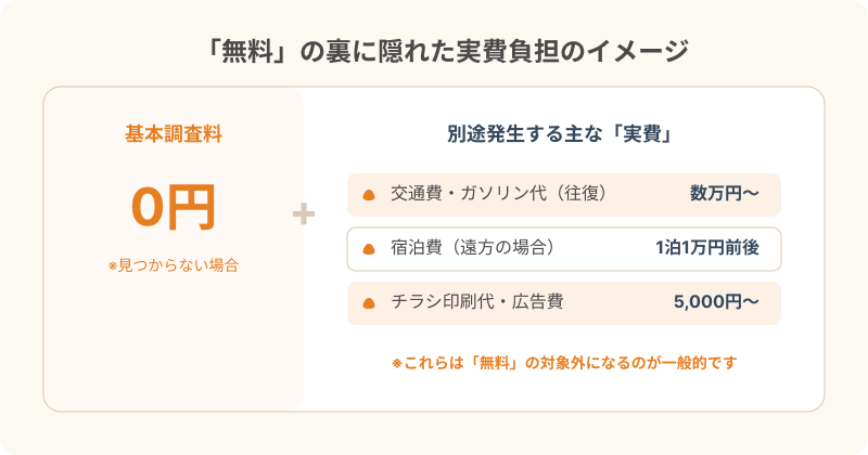 「見つからなければ無料」という言葉を聞くと安心しがちですが、無料になるのは調査の基本料金だけであるケースが多いです。