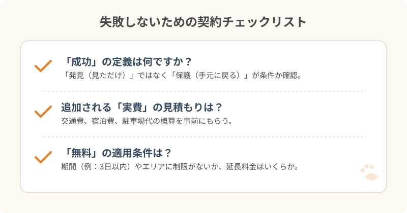 猫の姿が見えただけで費用を支払う契約内容では、愛猫が戻らないまま出費だけがかかる可能性に留意しましょう。