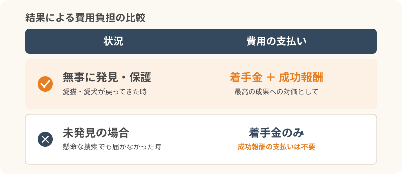 「もしも見つからなかったら、費用が無駄になってしまうのでは」と心配される方も多いはずです。成功報酬型のプランは、結果を重視する飼い主様にとって、合理的な仕組みとなっています。