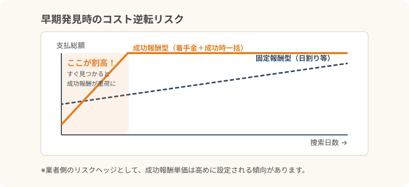 一方で、固定報酬型や着手金が必要な契約形態では、結果に関わらず、実際にスタッフが活動した日数分の人件費や実費がかかることになります。