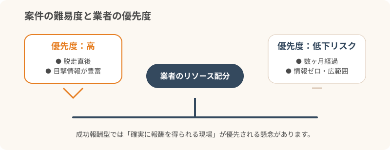 脱走から長期間が経過していたり、目撃情報が全く無い案件は、報酬が得られないリスクが高いため、効率重視の業者では後回しにされる恐れがあるのです。